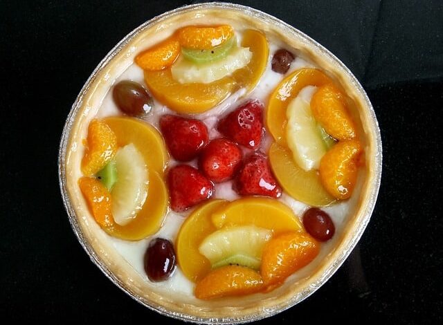 5. Para a montagem, coloque metade do creme e depois coloque todas as frutas da forma que desejar